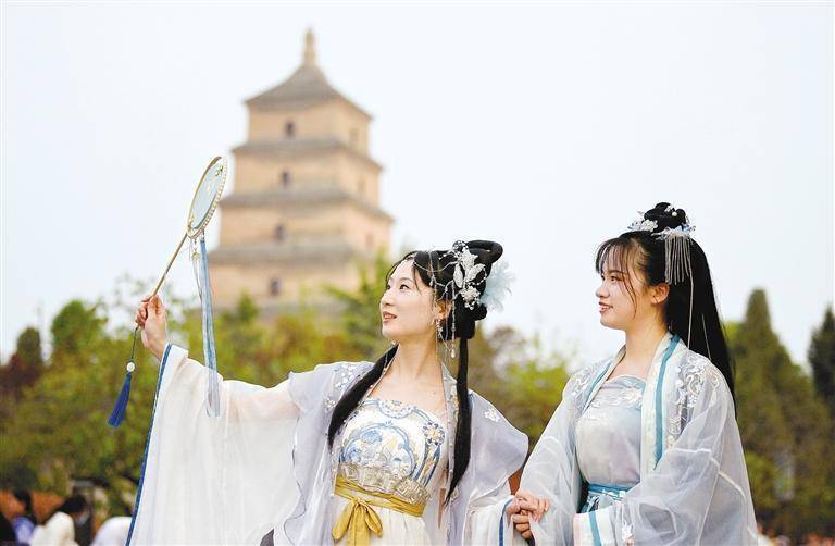 衣裙轻舞,环佩叮当,巧笑倩兮,花钿灼灼,身穿汉服的“00后”游客李月婷感慨道:“西安和唐装汉服的适配度太高了!”带着对传统文化的喜爱,这个“五一”假期,她和好友选择到西安来一场“穿越之旅”。