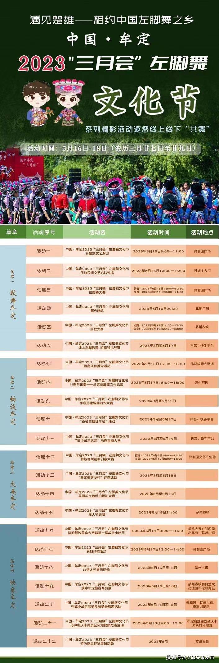 今年的“三月会”左脚舞文化节,分“歌舞牟定”“畅谈牟定”“大美牟定”“映象牟定”4个篇章,共有形式多样、内容丰富的22项活动,将为四海宾朋献上一场精彩绝伦的彝族文化盛宴。