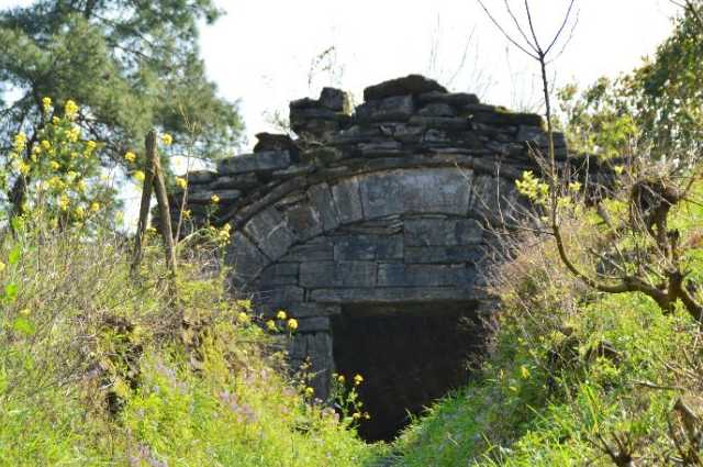 大黄在这样的路上,跑的很舒心,不时前后的忙着,很是卖力,不过主人眼里根本就看不到它的表演,因为前面能看到一点界关凉亭了,往前不多久就能看到山脊之上有一个关门,关门砖石砌成,上部是弯顶,这既是界牌,又是关卡,同时也是供行人休息的凉亭。