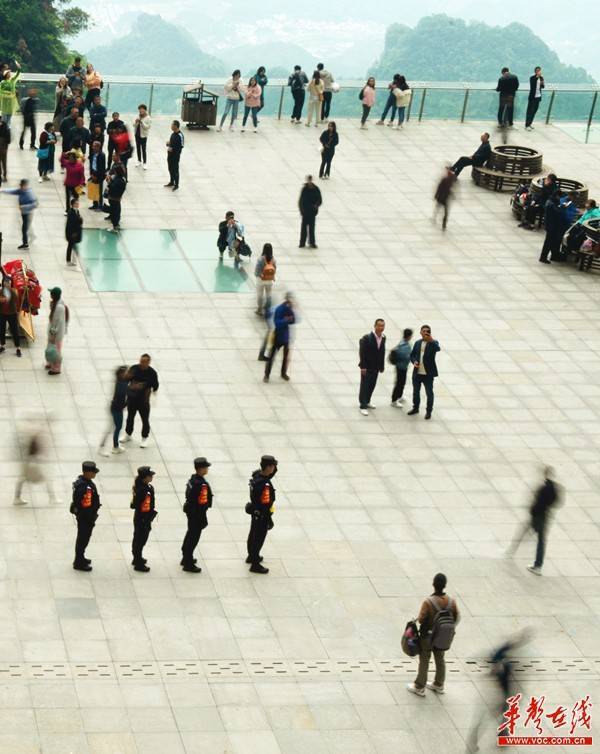 在今年新落成的袁家界派出所综合指挥室,大屏幕上实时显示各景点游客流量,系统自动调节红黄橙“三色”流量预警,值班民警不时通过广播提醒游客注意安全。在武陵源“标志门”广场,执勤民警踩着“警用平衡车”在游客中来回穿梭,引导游客有序排队,提供咨询服务。在“天下第一桥”,河南籍游客杨先生通过“失物招领小程序”,不到半小时,身份证失而复得……