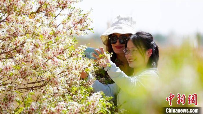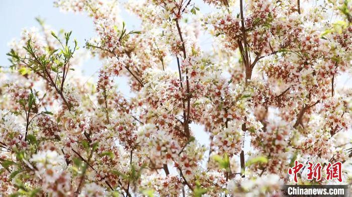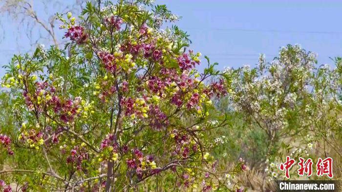 中新网乌鲁木齐5月10日电 (王小军 刘雨珊 阿曼江·阿力甫)5月初,地处塔克拉玛干沙漠腹地的新疆巴州且末县的防沙治沙站内的750亩文冠竞相绽放,粉白相间的文冠花团团簇簇,像挂满枝头的风铃迎风摇曳,为塔克拉玛干沙漠增添了一抹别样风情。