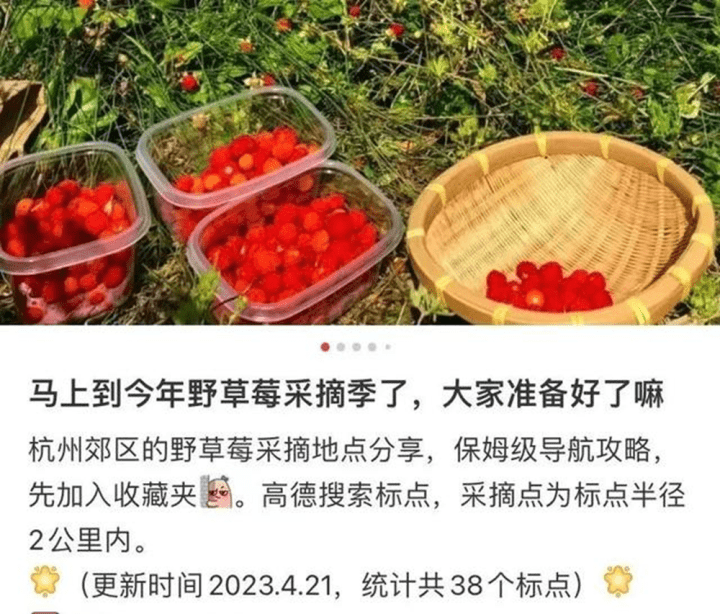 社交平台上,有网友说瓶窑北村,野草莓漫山遍野,径山小古城村的竹林里、富阳大洋坞的水库边上,也有人满载而归。