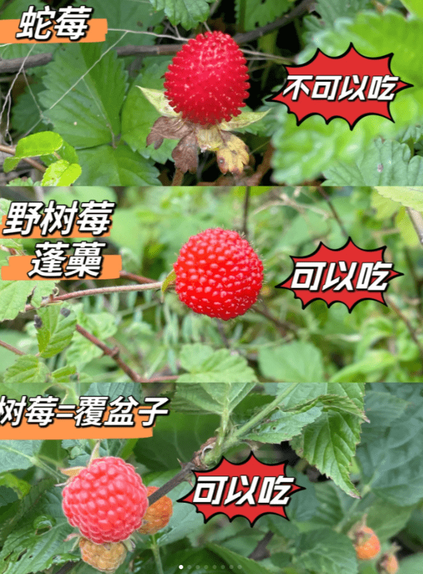 特别要注意有一种植物叫做蛇莓,长得与野草莓很相似,不能吃。蛇莓果实是实心的,外表像是一个圆球表面上长出一粒粒的红色小“触角”。从花色区分也不一样,野草莓开白色花,蛇莓开黄色花。