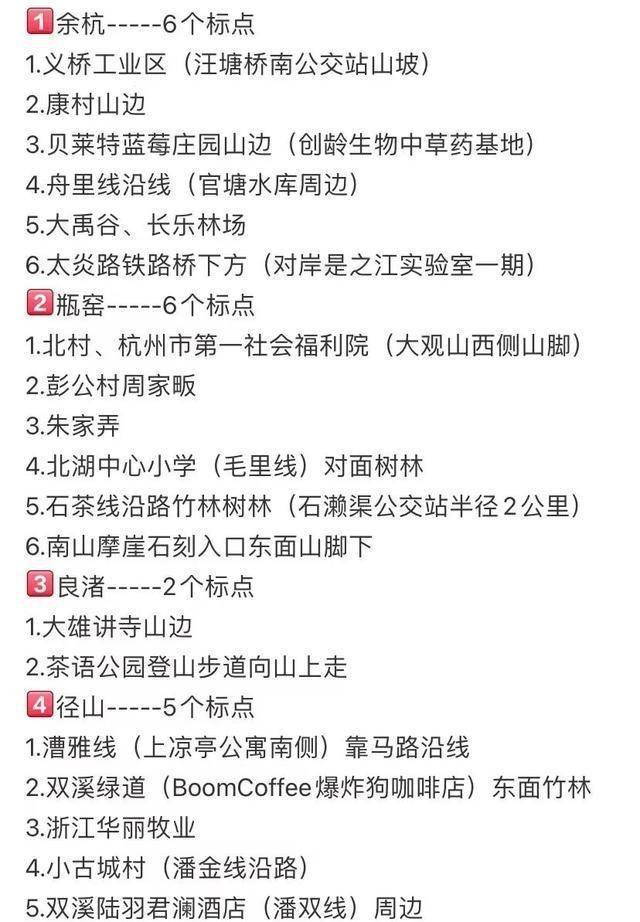 网友“小西斯Jodi”堪称摘野草莓满级爱好者,最近他在社交平台晒出了自己整理好的野草莓分布地图和部分地点的保姆级导航路线,涉及杭州瓶窑、良渚、径山、闲林等38个地点。他告诉潮新闻记者,这38个地点,他这两年基本全部去过,“今年富阳银湖、大洋坞几个水库,径山、瓶窑方向找到的野草莓比较多。”