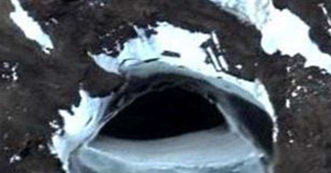 这还并不是最令人震惊的,科学家又放出了一张照片,这张照片同样是谷歌卫星所拍摄的。通过照片我们可以看到,在南极的一座山脉中竟然出现了一个巨大的洞口,这个洞口的深度无人知晓,通往何处也没有定论。