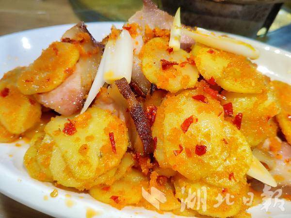 洋芋粉粑粑炒腊肉是恩施的一道特色菜。据说洋芋粉粑粑炒腊肉最早是在清代乾隆年间开始有的。最初始于民间餐桌,而后因口味绝佳升为官菜,渐渐流传了下来。用沙地乡洋芋制成的洋芋粉粑粑,浓香绕齿,软糯不腻,佐以高山腊肉交汇融合,油汁与食材相互滋养,鲜香十足,让人百吃不厌,回味无穷。