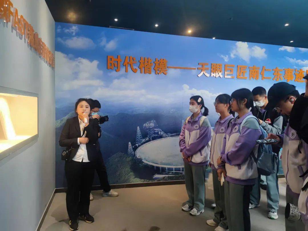 然后,我们来到了南仁东事迹馆。体会了这位传奇科学家艰难却又英雄的一生,我们都大受感动。南仁东曾说:“美丽的宇宙太空,正以它的神秘和绚丽,召唤我们踏过平庸,进入到无垠的广袤。”当一个人踮起脚尖时,全世界都挡不住他的阳光。他的精神会化作天上的一颗心,留给世人可循的踪迹,不灭的光。