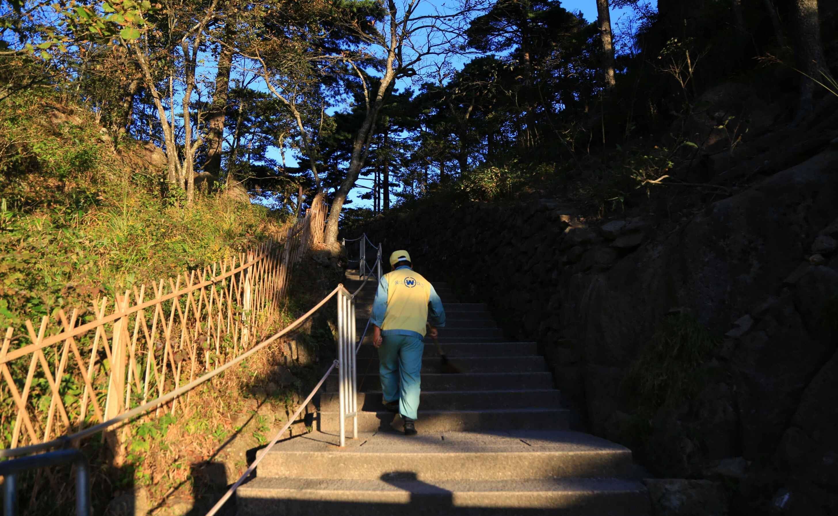 国庆长假,黄山风景区游客接待量明显增多,随风吹散垃圾和乱扔弃的垃圾也比平时多。这让黄山景区环卫工们比平时更加辛苦,特别是放绳工,为了保持悬崖风景的洁净,那些被客人丢弃或是被风刮到山崖下的矿泉水瓶、餐巾纸等垃圾,只有靠他们放绳下去才能捡起。