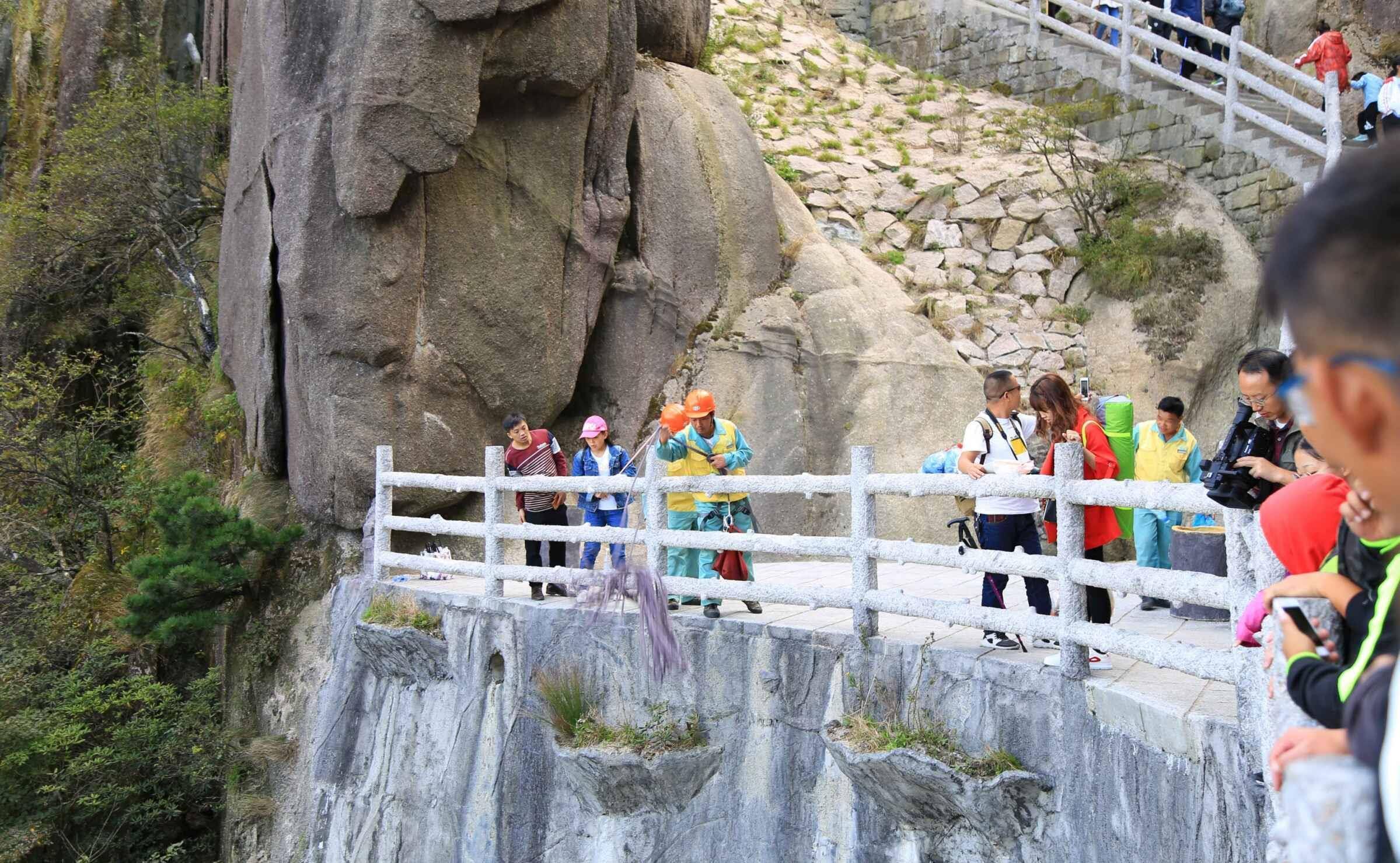 在去往迎客松景点的一处新开发的游步道上,年近五旬的李培生正在和同事一起仔细检查身上的放绳装备。几分钟后他将在90度的垂直悬崖上进行国庆当天的最后一次高空工作。