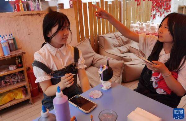 5月10日,两名年轻人在山东济宁环西北里文创街区体验手工项目。
