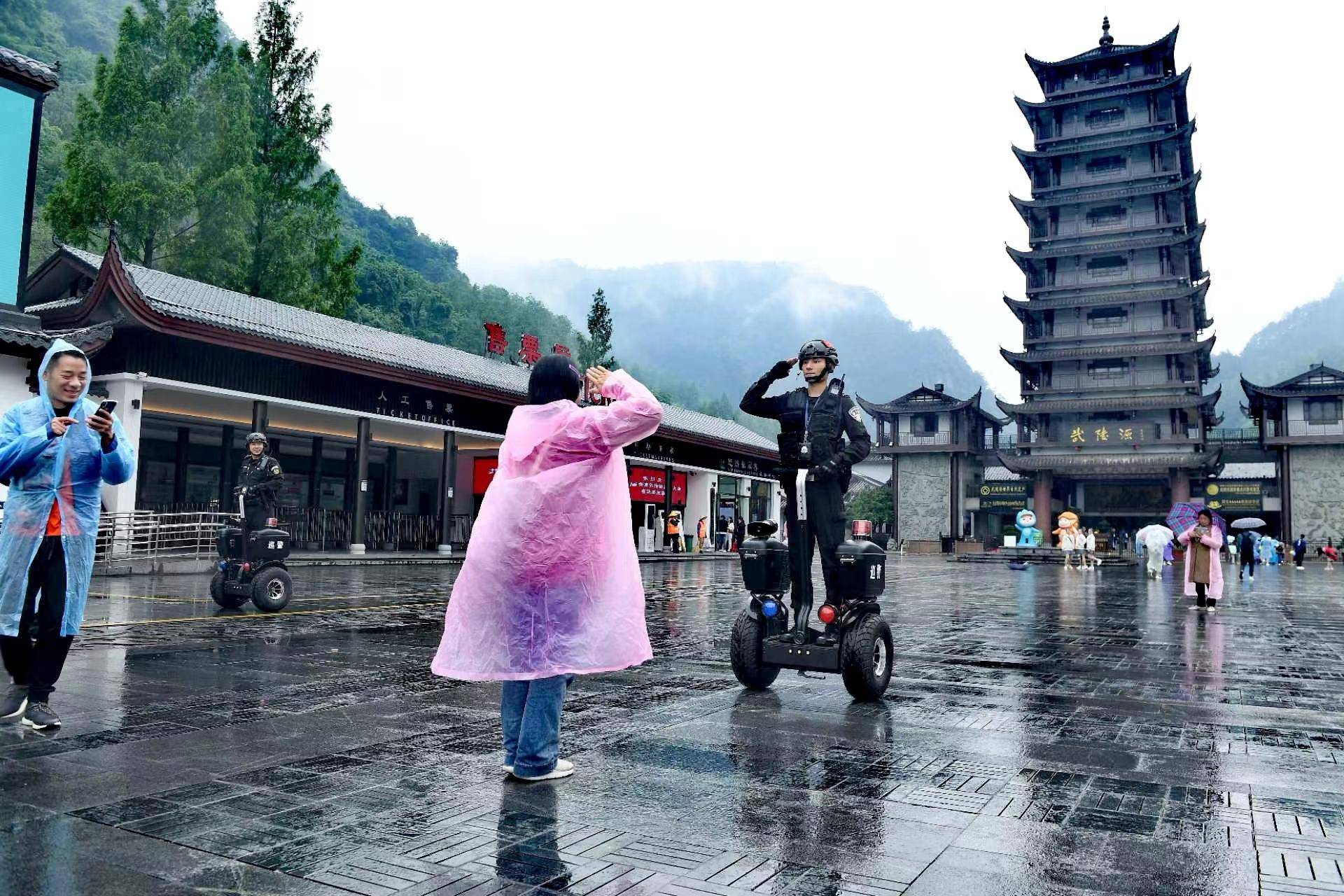 在今年新落成的袁家界派出所综合指挥室,大屏幕上实时显示各景点游客流量,系统自动调节红黄橙“三色”流量预警,值班民警不时通过广播提醒游客注意安全。在武陵源“标志门”广场,执勤民警踩着“警用平衡车”在游客中来回穿梭,引导游客有序排队,提供咨询服务。在“天下第一桥”,河南籍游客杨先生通过“失物招领小程序”,不到半小时,身份证失而复得……