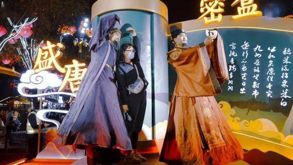 “《西游记》中九九八十一难,第一难是什么?”“不知道,不要紧,来,拍个照。”夜色渐浓,西安市大雁塔下的大唐不夜城华灯熠熠,流光溢彩。两位身着古装的演员,分别扮演唐代名人房玄龄和杜如晦,出题与游客进行互动,幽默风趣的提问和回答引得台下观众不时发出阵阵欢笑。