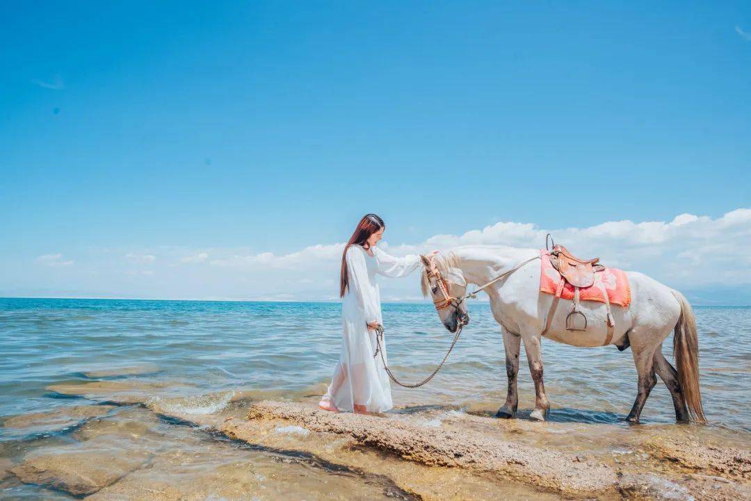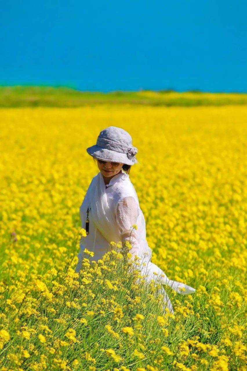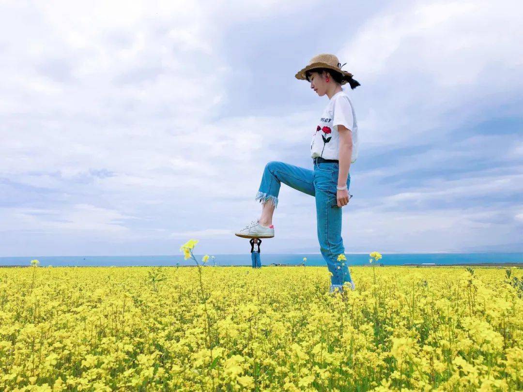 7月的青海湖,水天相接的蓝,亮澄澄的黄,正是姑娘们拍照的好时机。