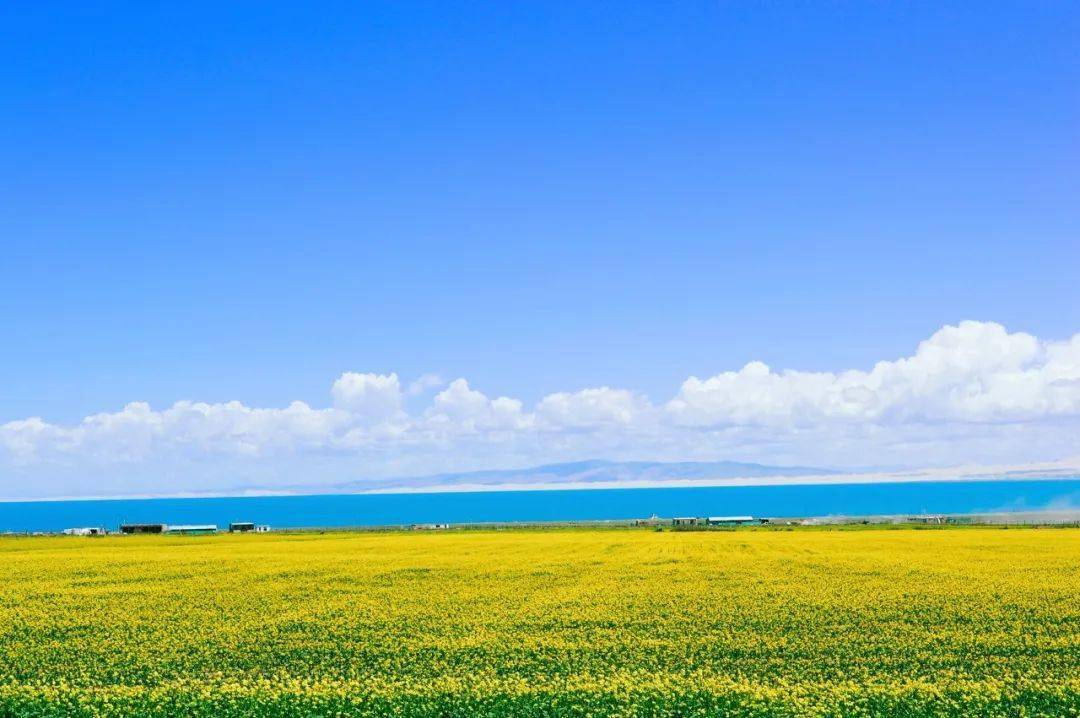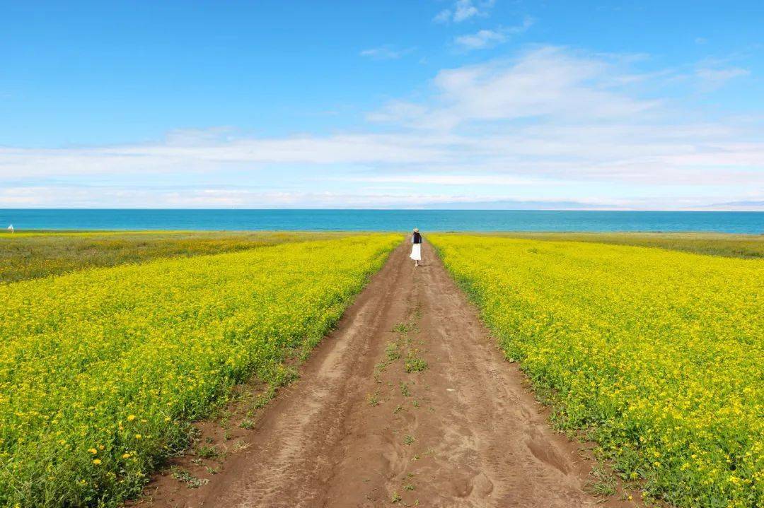 蔚蓝的天空下,笔直的公路向远处延伸,如大海般看宽广的湖面泛起阵阵涟漪,明艳的油菜花海望不到尽头……