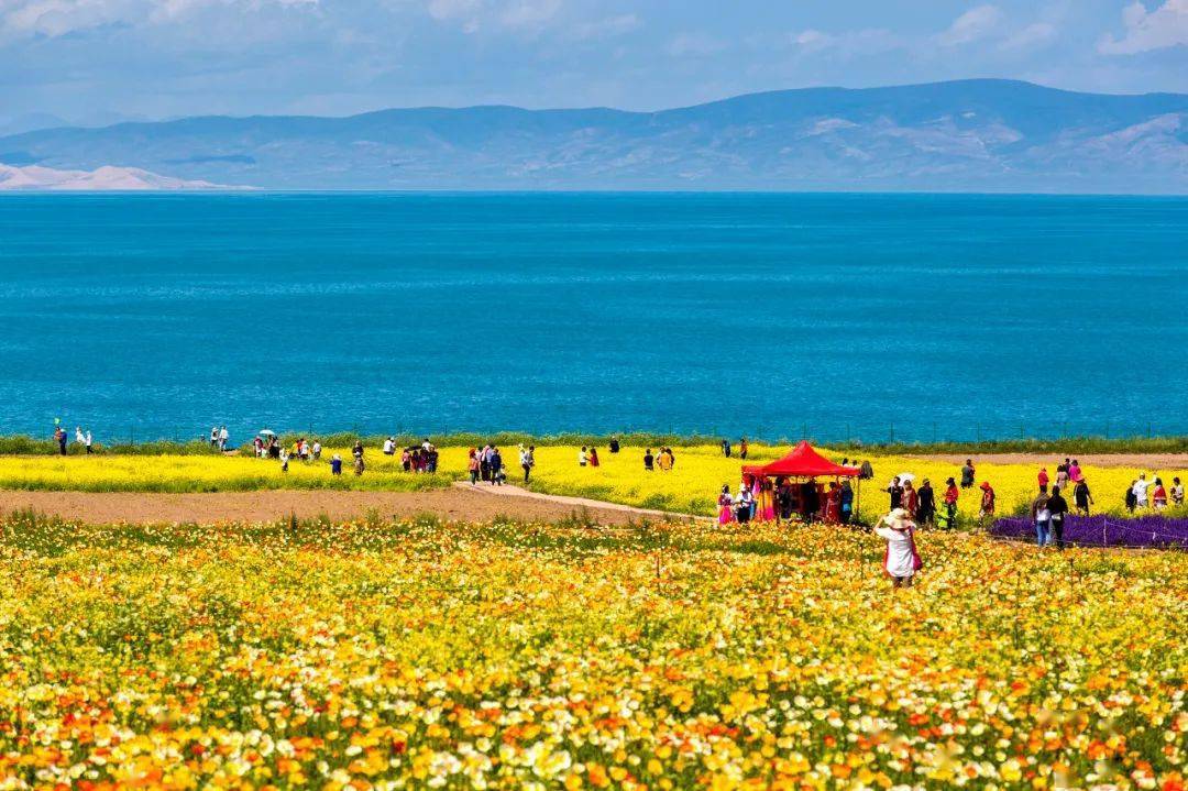 蔚蓝辽阔的湖水旁,不仅有望不到头的灿烂花海,还有穿着各色裙子的漂亮姑娘。