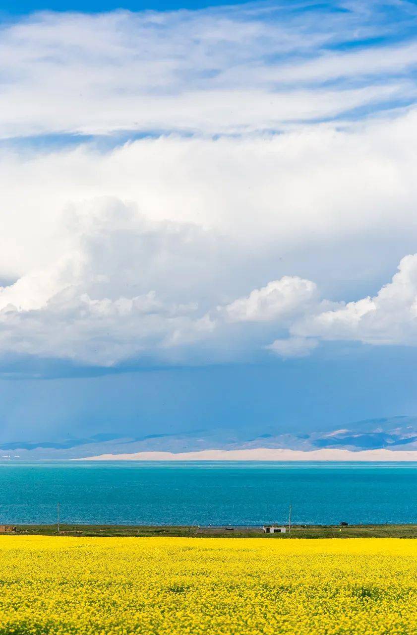 7月的青海湖也是最亮眼的,碧波万顷的湛蓝外围散布着金灿灿的亮黄,美的高调而热烈。