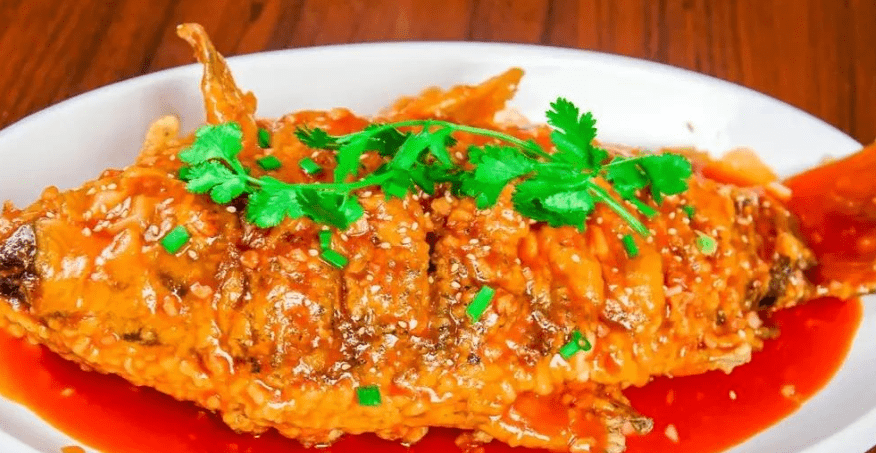 它的方法是把鱼清理干净,在两边画一厘米的刀口,用盐腌制,然后在刀口撒上面粉,最后把整条鱼撒上面粉。在锅里炸至金黄色,将准备好的材料烧成浓汁,迅速倒在炸鱼上。