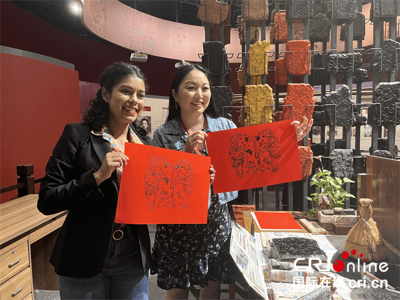 外国网红展示自己制作的木版年画 摄影 万庆丽