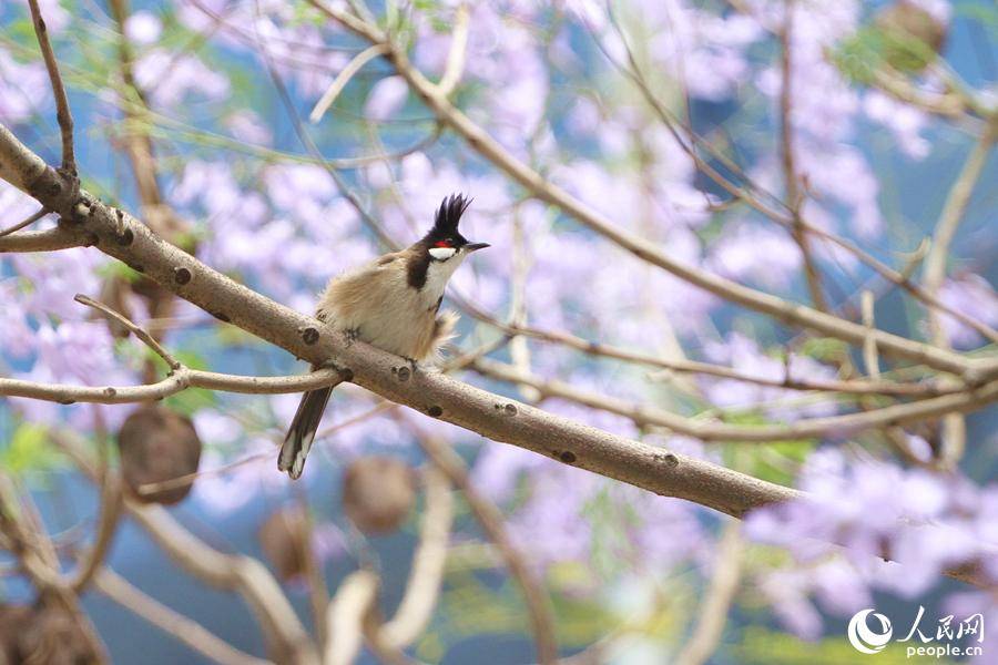 一只红耳鹎在蓝花楹枝头休憩。人民网 陈博摄