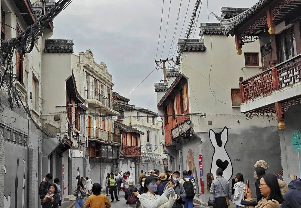 忽如一夜间,方浜中路变身“外滩猫街”刷屏,原本清冷的街道引来大量市民前来猫咪墙绘前打卡。这是外滩现代的、新颖的、艺术化的猫咪图样,被艺术家画在老建筑的封装墙面上,与老建筑毫无违和地共处,就像是一个引信,唤醒了等待更新的百年商业老街的生命之源。