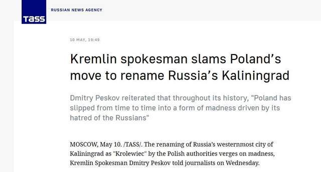 而波兰人调戏俄罗斯的举动,可着实把俄罗斯人气炸了。而克里姆林宫发言人佩斯科夫就是第一个坐不住的,他立刻批评了波兰方面的举动是“近乎疯狂”的,形容“波兰人对俄罗斯的恐惧症,已经被仇恨驱使到了疯狂状态”。在此基础上,他还敦促波兰人应该更改错误地做法,尊重俄罗斯的城市命名规则。