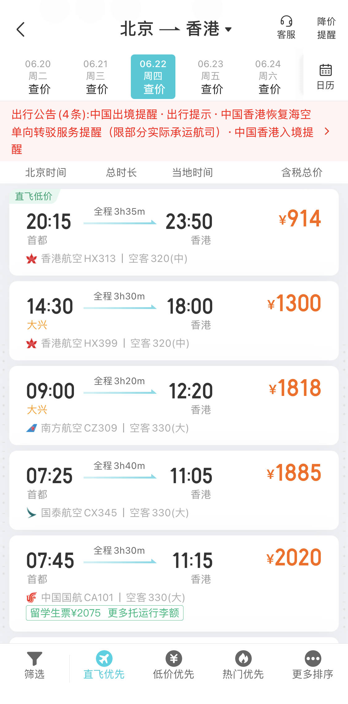 从机票价格来看,端午假期,北京直飞香港的含税机票价格最低为914元,上海直飞香港的含税机票价格最低为1004元,杭州直飞澳门含税机票价格最低为1049元,较五一期间降低三成以上。此外,旅客可从北京、上海、杭州、长沙等内地44座城市乘高铁直达香港。