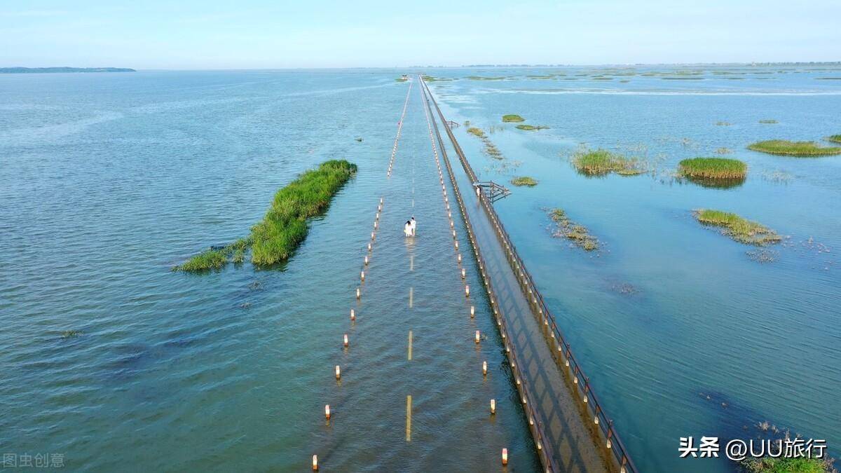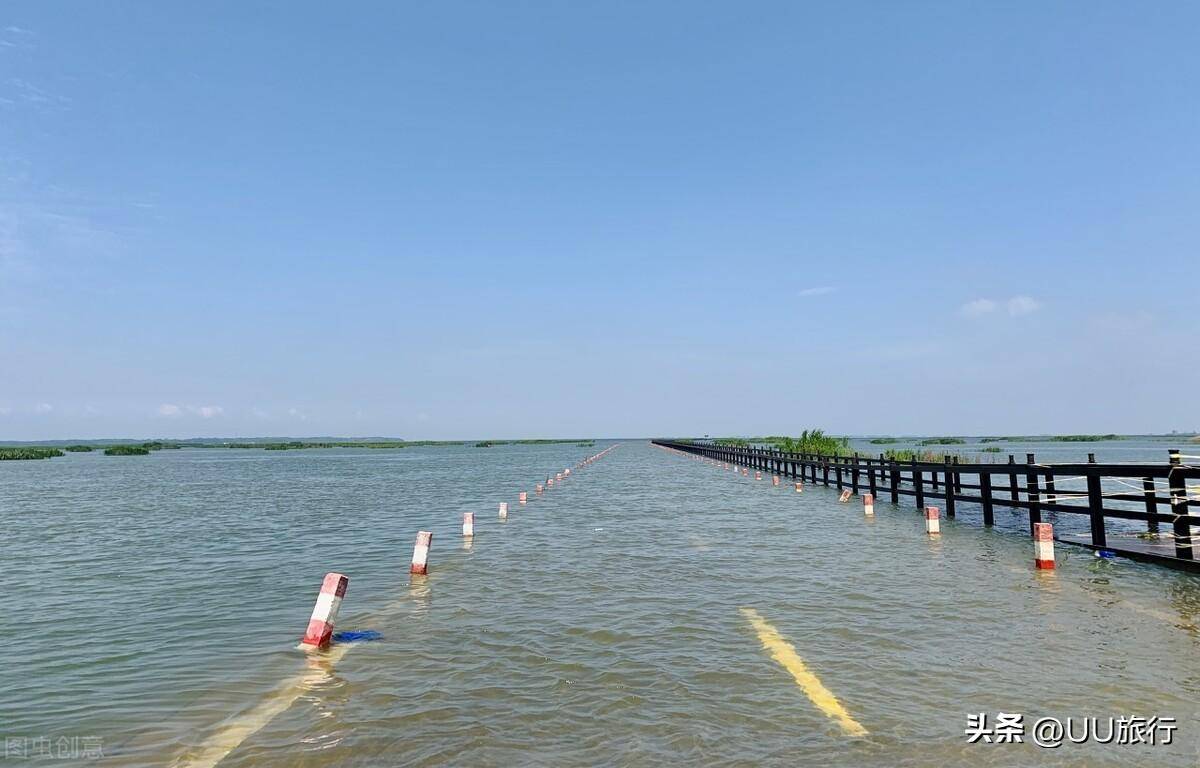 每年五六月,水刚淹没公路的时候,和汛期快结束时,车子还能开入其中,水位较高的时候,只能步行进入栈道,体验这般动画电影的感觉。秋冬季潮水褪去,又是一副草原和芦苇荡,藏着无数过冬的候鸟。