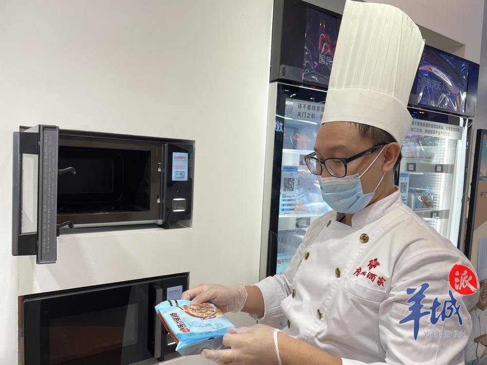 粤菜师傅现场给大家“烹饪”美食:撕开产品包装袋的一角,在微波炉前扫一扫外包装上的条形码,微波炉就会自动识别出产品名称和烹饪方式、时长,然后把预制菜放进微波炉内,几分钟后,一份正宗的广式点心就能食用了。