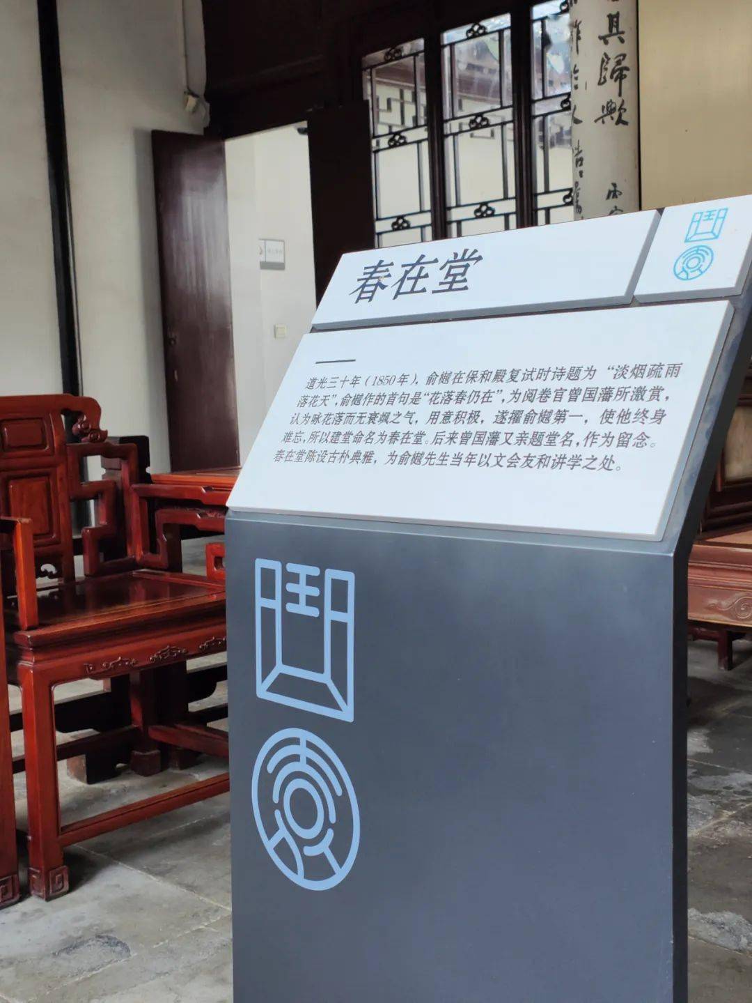 “乐知堂”旁边是俞樾讲学会友之所,名曰“春在堂”。俞樾在道光二十年保和殿应礼部复试,试题是《淡烟疏雨落花天》,俞樾答卷的首句是“花落春仍在”,主考官曾国藩甚为赏识,认为“此与小宋(宋祁)《落花》诗意相似,名位未可量也。”擢为第一。俞樾用“春在”作为堂名,并作《春在堂记故事》,以纪念他的这一人生高光时刻。恩师曾国藩题写“春在堂”匾额,他的门生曾任兵部尚书的吴大澂用篆书写的《春在堂记故事》刻在堂内屏门上。