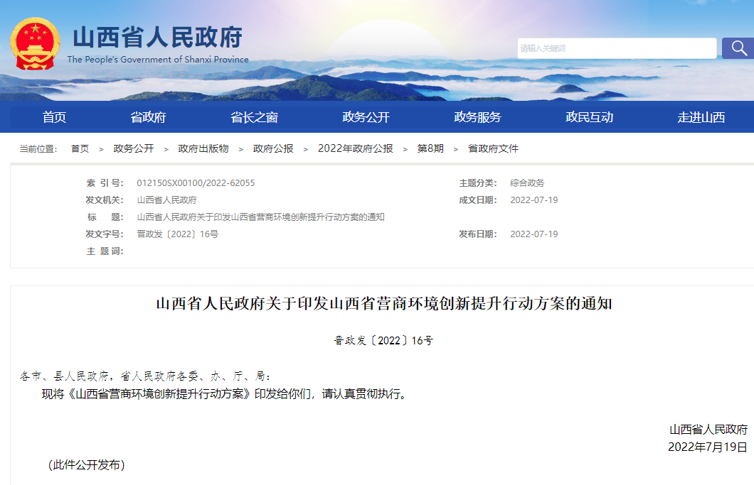 近年来,山西省政府结合实际,提出具体举措、具体要求、具体方案、具体行动,下大力气改善营商环境。2022年7月,山西省发布《关于印发山西省营商环境创新提升行动方案的通知》,提出五项重点任务,着力打造公平公正的法制环境、高效便捷的政务环境、诚实守信的信用环境、开放开明的人文环境、优质完善的要素保障,并列明119条改革事项清单,具体责任单位落实执行考核。