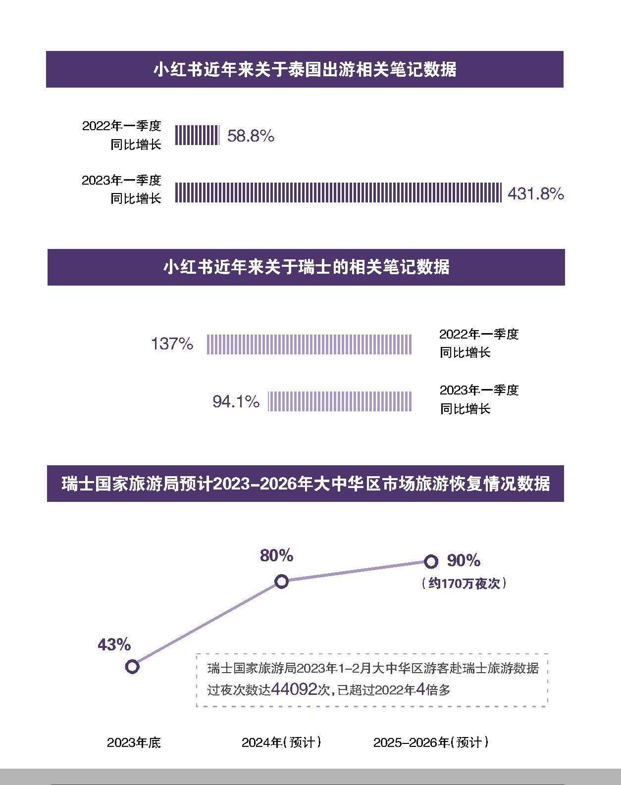 在5月11日举行的2023深蓝媒体智库年度峰会上,《中国旅游目的地复苏调查报告》对外发布,深蓝智库综合机构提供的数据梳理发现,不只是内地小镇,在暂别中国游客的三年里,包括瑞士、泰国等在内的境外旅游目的地也开始“云种草”。“遥望阿尔卑斯山”等一系列营销的落地,让这些境外目的地在放开伊始收到了“种草”的回馈。