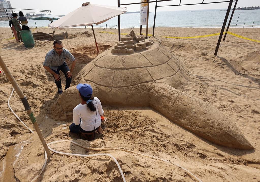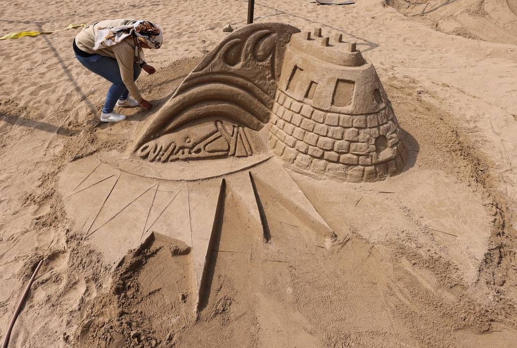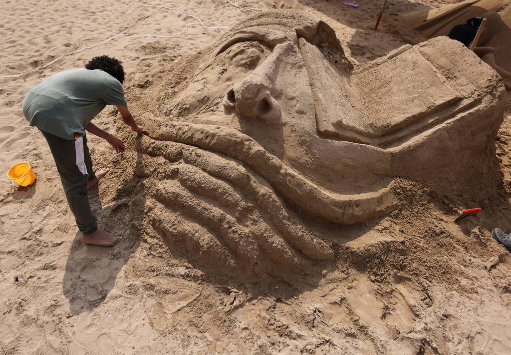 埃及亚历山大,亚历山大沙雕节举行最佳沙雕作品比赛,Abd El Rahman Edres在创作沙雕。