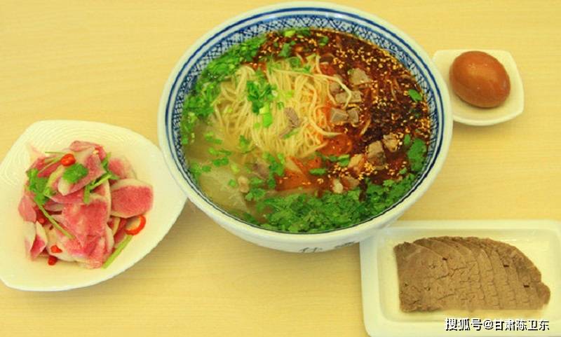 兰州牛肉拉面,是西北地区最常见的一种面食,也是兰州市传统的名优小吃之一。其起源于清嘉庆年间,创始人是国子监太学生陈维精。它具有“一清、二白、三红、四绿、五黄”的特征,且色香味美,誉满全国。