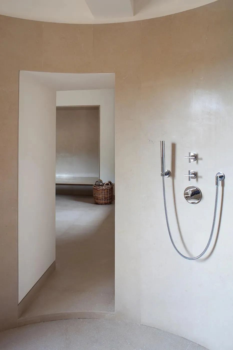 主浴室圆弧形轮廓+百分百留白的墙壁,营造出了一种份外轻松的静谧氛围,忙碌一天后到家,站在这里任凭花洒冲洗,什么都不想,什么都不做,只静静放空,卸下疲劳。