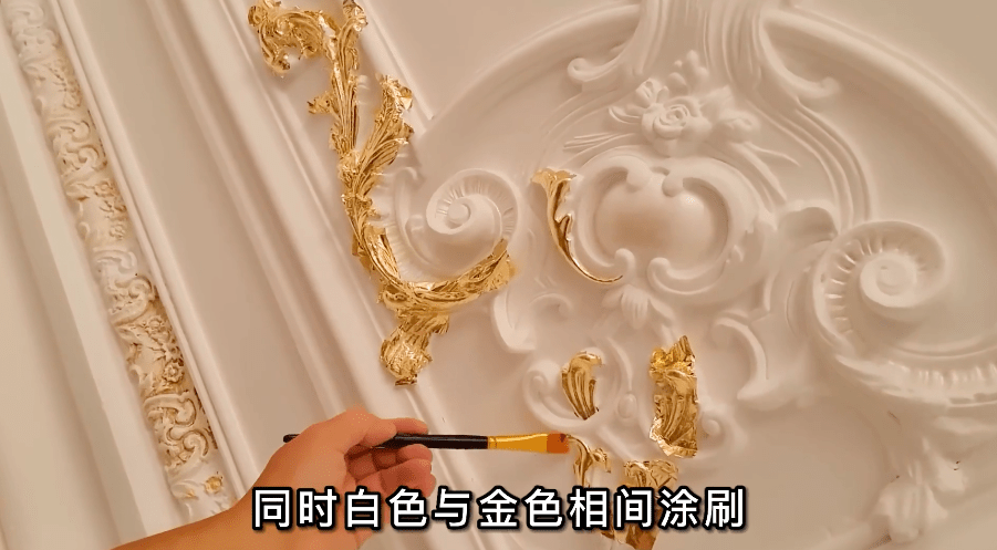 完工后进行墙体美化,将白色和金色的油漆相间涂刷,细节处用极细画笔勾勒补充;