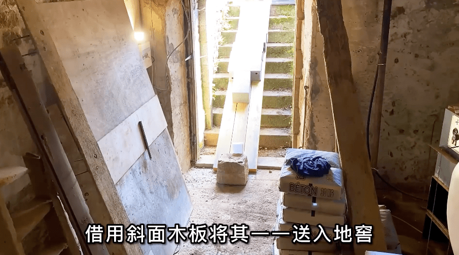 此时,运送蜂窝砖的货车也刚刚抵达,阿德在地下室入口楼梯上铺设了斜面木板,通过斜面将砖块一一送入地窖。