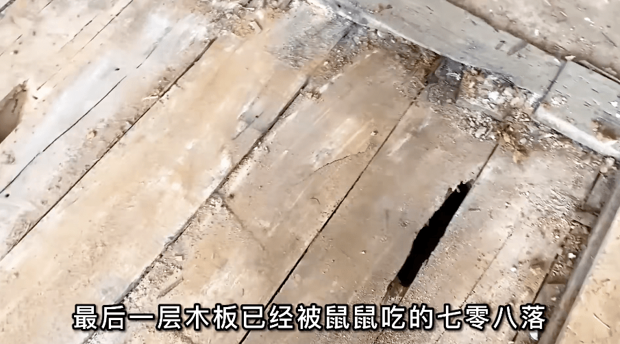 果不其然在最下方,看到已经被老鼠啃得破破烂烂的最后一层木板。