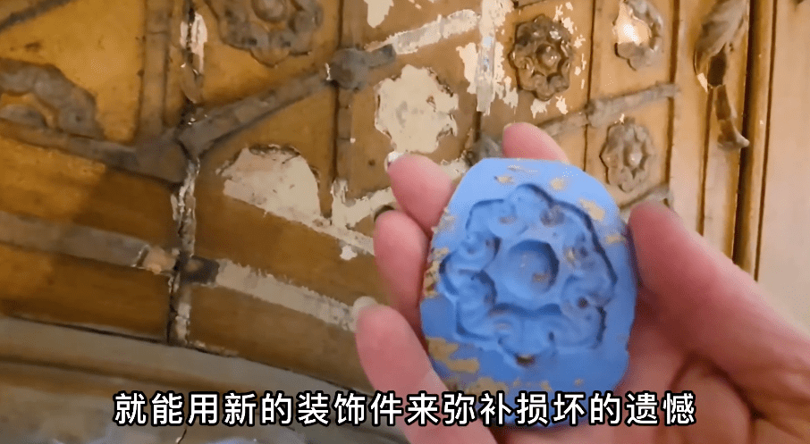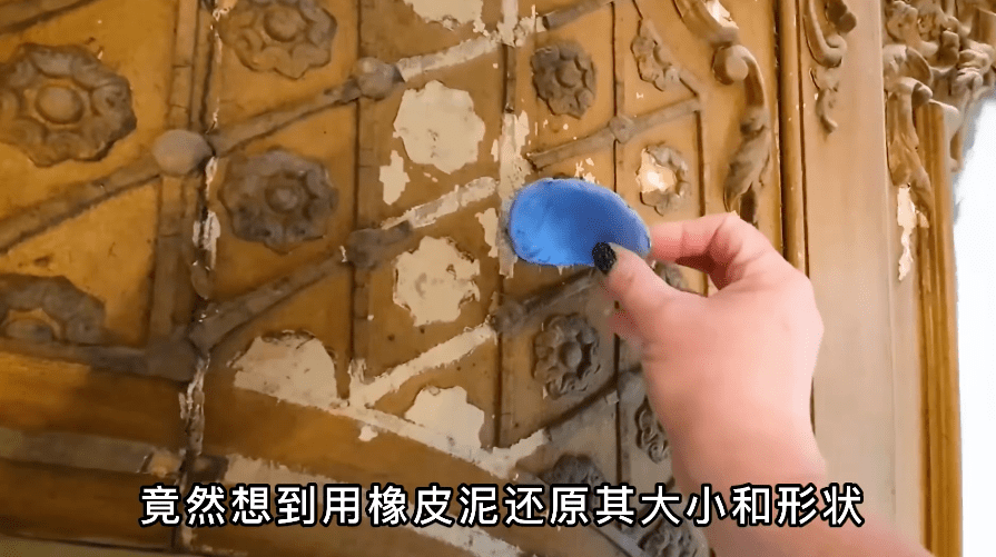 墙面上有些已经破损的浮雕,她还聪明的想出了橡皮泥大法——只需将橡皮泥平铺在浮雕之上还原其大小和形状,之后再去店里重新定制,以弥补损坏的遗憾。