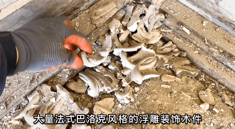 来到客厅,大量法式巴洛克风格的浮雕装饰木件掉落在地面上;