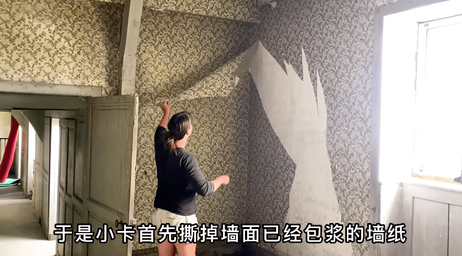第一步,就是先拆除屋内原有的装修。妻子小卡负责撕掉那些早已看不出本身成色的墙纸,露出有些斑驳发霉的墙面;