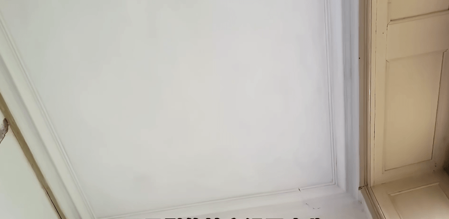 天花板上有不少开裂的缝隙,小卡将漆料涂在缝隙处并用手抹平,接着用砂纸打磨,最后再上一层油漆。
