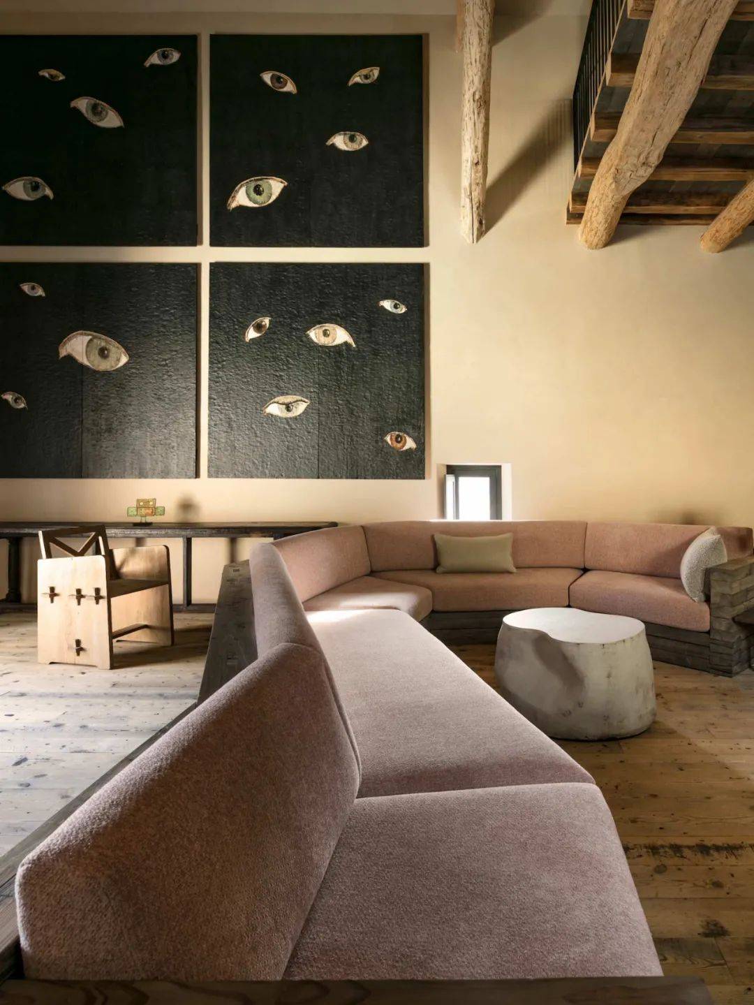客厅另一侧摆放了超长的弯曲沙发,旁边挂着一幅黑色的壁画,充满着艺术家的神秘与个性。