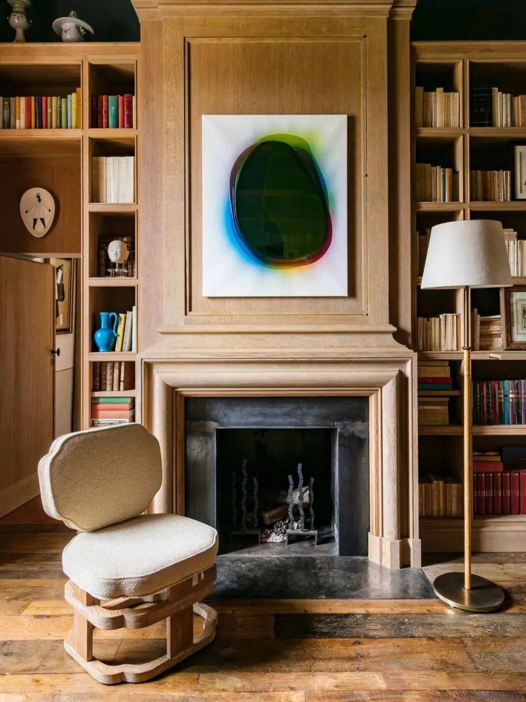 彩色单人椅虽棱角分明,但却因材质给人柔和的感觉。前方原木茶几也如此,曲线轮廓与沙发座椅相呼应,丝毫没有古堡冷酷庄严的感觉。