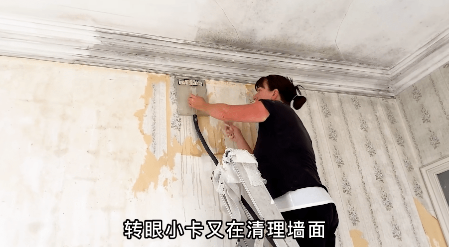 小卡短暂休息后,继续为发霉的墙面刷上新的油漆;
