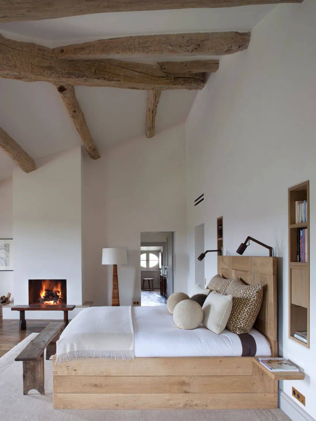 主卧以白墙和组装的原木装饰为主,打造纯粹本色。天花板上的木头还原了自然树干的形状,和床头靠板床尾凳一一融贯。