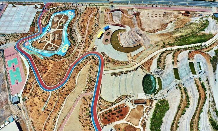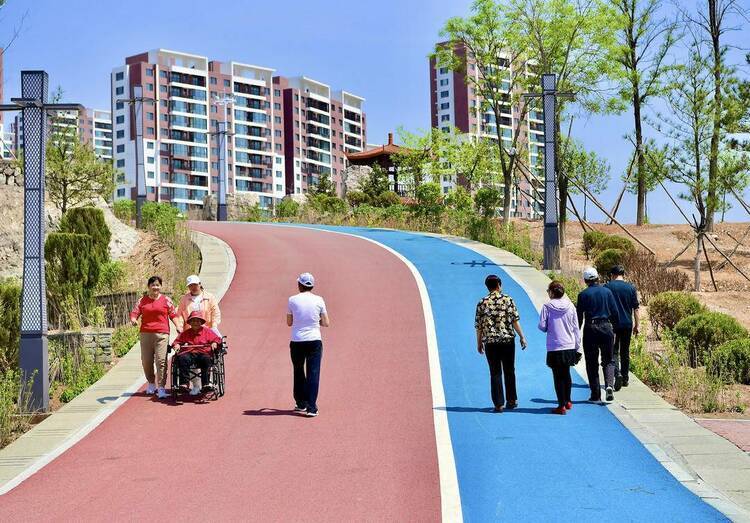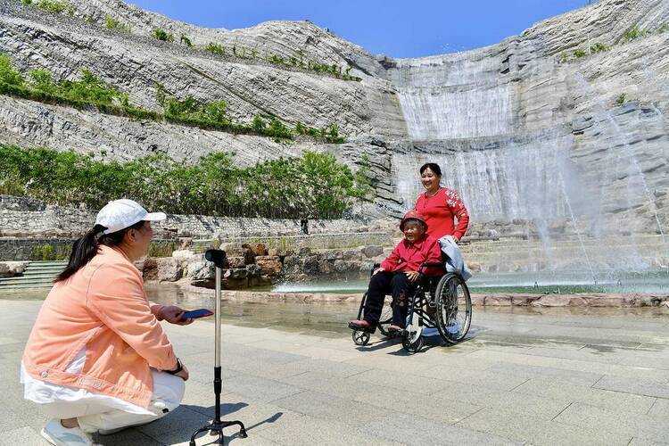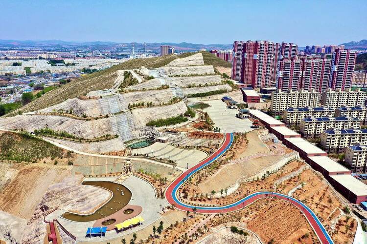 据了解,公园于2021年11月开始实施山体生态修复工程,修复面积28.19公顷。建成后的山体公园不仅修复了破损山体岩石,建成了诸多景观和体育运动场地,山体间还立体栽植了大量花草树木。举目望去,多彩醒目的步行道、水泉瀑布、优美雕塑等与修复后的岩石融为一体,层次分明、靓丽醒目,有效改善了居民环境,提升了百姓生活品质,目前已成为市民休闲娱乐“打卡地”。图为市民在生态修复山体公园里游玩。(摄影 吴大军 记者 仇一军)