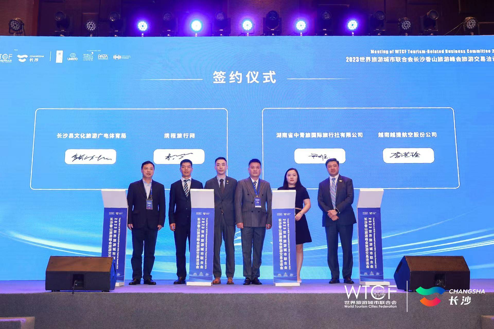 活动现场,在世界旅游城市联合会和长沙市文旅部门领导的共同见证下,中国铁路旅游联盟与长沙市旅行社协会,越南越捷航空股份有限公司与湖南省中青旅国际旅行社有限公司,上海携程商务有限公司分别与长沙县文化旅游广电体育局和长沙市旅游饭店业协会签署战略合作协议。签约双方将充分发挥资源优势,利用自身影响力和渠道平台等资源,为长沙市文旅产业发展提供全方位战略支持。