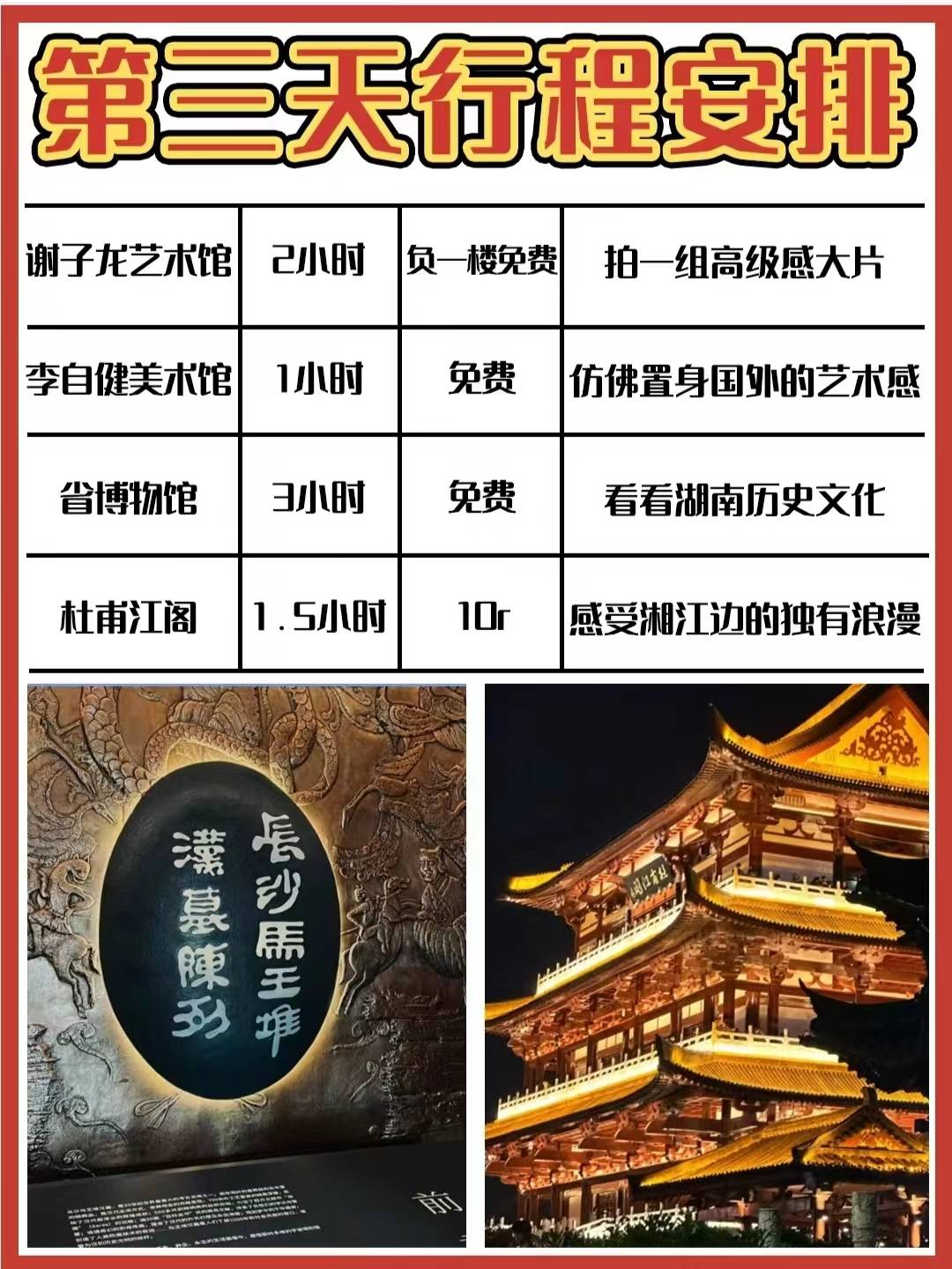 计划暑期去长沙旅游的姐妹一定要码住的攻略 2023年去长沙旅游超实用攻略💯💯💯 - 🌟行程安排 DAY1⃣️:五一广场→国金中心→黄兴路步行街→坡子街→太平老街 DAY2⃣️:橘子洲(可体验湘江夜游)→岳麓山→爱晚亭→湖南大学城 DAY3⃣️:谢子龙艺术中心→李自健美术馆→湖南省博物馆→杜甫江阁 - 橘洲之星夜游可以找友艇君买票哦~ . via.小红薯今天吃什么