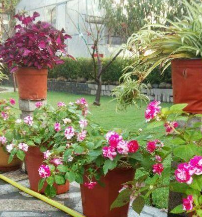 沿路摆放的盆栽品种多样。