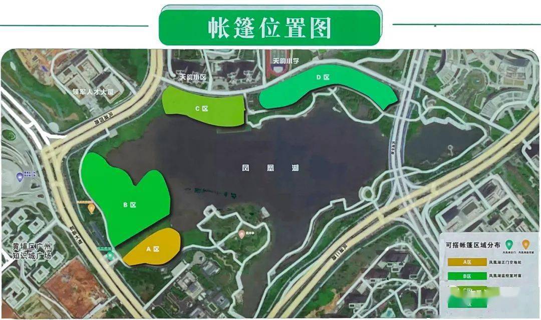 从照片中可看到,凤凰湖公园有A、B、C、D四个区域可搭帐篷,其中创新大道、天韵小区旁边分别各两块区域。